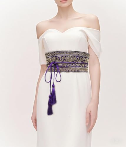 FANFAN Mexican Embroidered Belt for Women Ethnic Gold Belt Line Royal Blue Purple Adjustable Belt Boho Tassel Belt Wedding E5 5