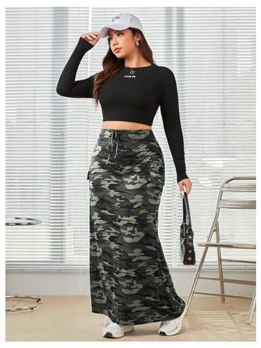 HOT ! Verdusa Women's Plus Size Casual Drawstring High Waist Camo Print Bodycon Long Skirt