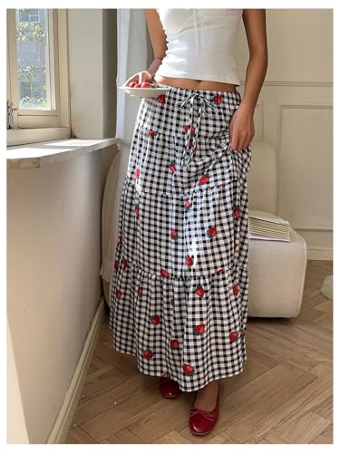 More information about Women's Gingham Cherry Graphic Midi Skirts Drawstring Waist Ruffle A Line Flowy Skirt
