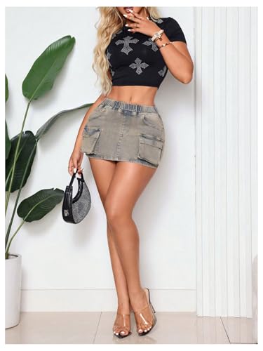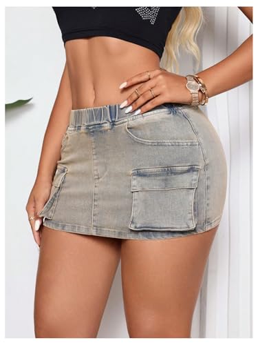 HOT ! MakeMeChic Women's Y2K Cargo Skirt Elastic Waist Skinny Denim Mini Skirts with Pockets