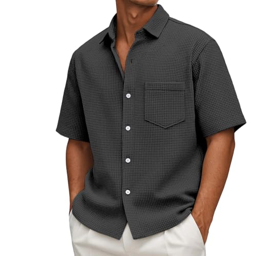 Mokaloha Mens Shirts, Men's Loose Casual Waffle Solid Color Button Short Sleeve Shirt 1