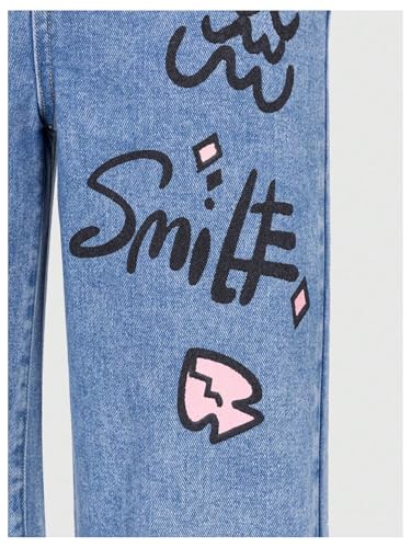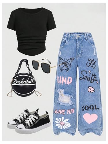 GORGLITTER Girl's Jeans Baggy Wide Leg Graphic Denim Pants Y2K Ripped Zipper Fly Long Trousers with Pockets 6