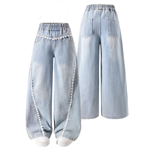 HOT ! Girls Baggy Jeans, Wide Leg Pants with Lace Trim - Trendy Loose Fit Casual Pants with Pockets for Everyday Wear