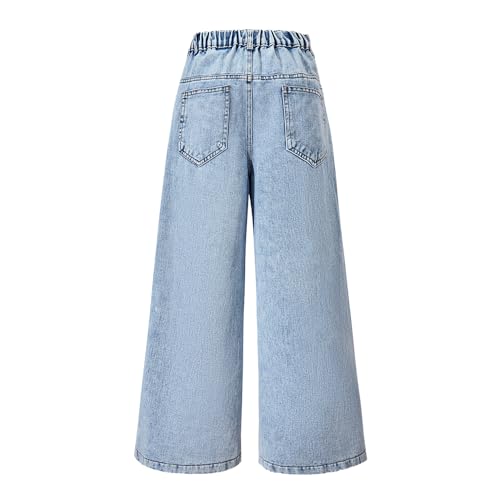 Girls Ripped Baggy Jeans - Elastic Waist Wide Leg Denim Pants with Pockets for Kids 5