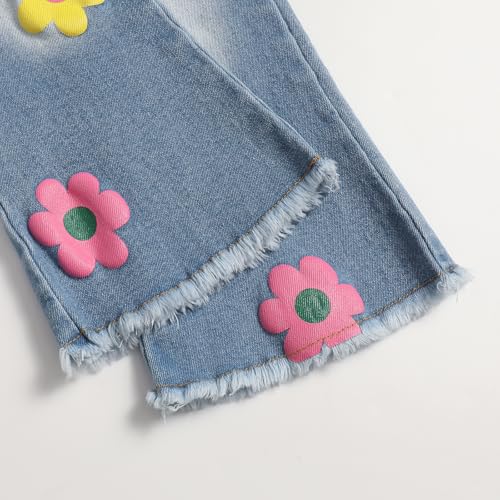 Girls' Casual Denim Pants Elastic High Waist Flare Floral Print Jeans 6