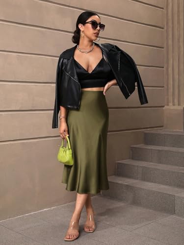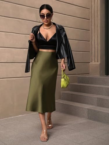 • Slight Stretch / A Line / Regular Fit / Zipper / Army Green / Satin / Midi / Unlined / Plain / No