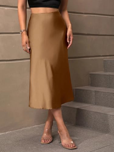 • High Waist / Brown / Regular Fit / Flared / Plain / Zipper / Unlined / Slight Stretch / Midi / Machine wash, do not dry clean / Satin / 97% Polyester, 3% Elastane