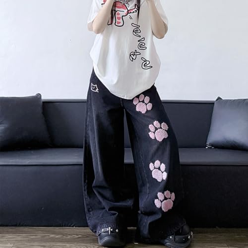 More information about Kawaii Fashion High Waisted Wide Leg Jeans Y2K Casual Harajuku Cute Cat's Claw Patchwork Pants for Women