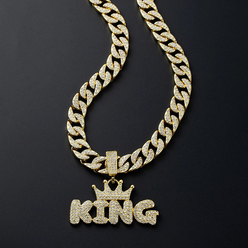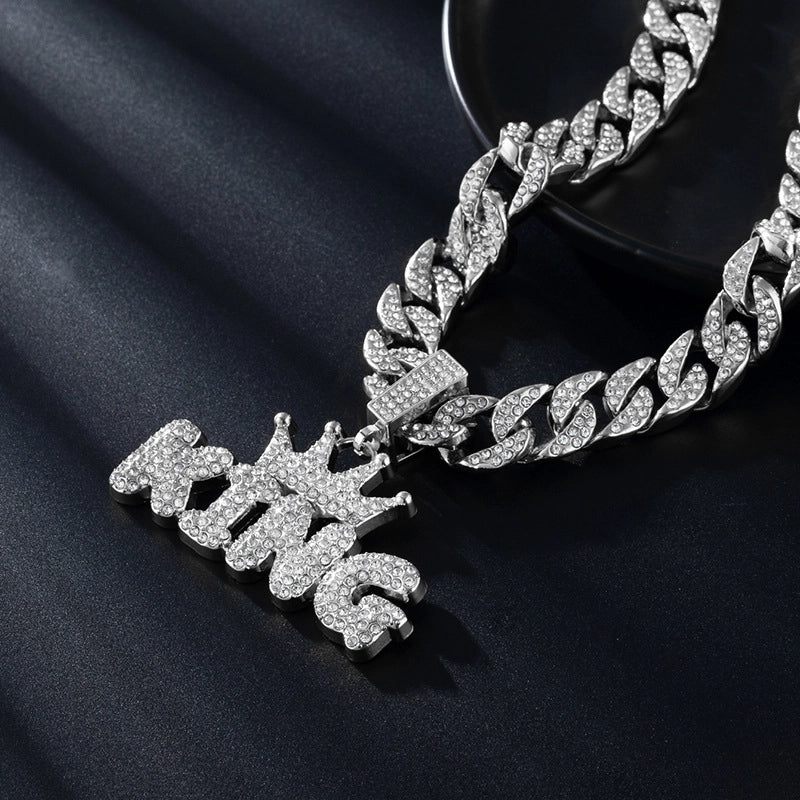 HOT ! Style Crown Letters King Full Diamond Pendant Thickened Cuban Link Chain Trendy Men Hip Hop Sold Jewelry