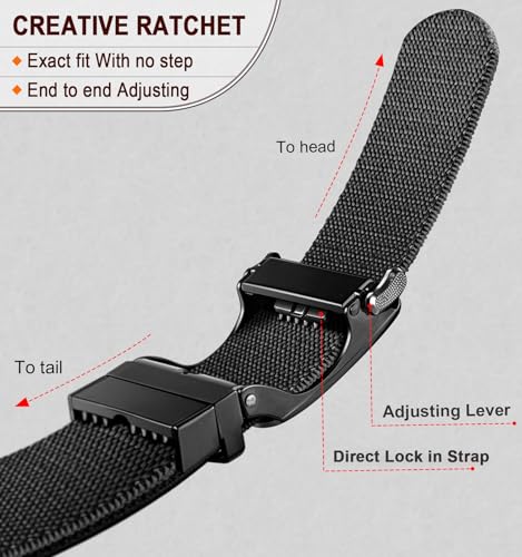 • EASY TO ADJUST --Creative Direct-Lock ratchet mechanism enable the buckle to lock in anywhere on strap directly for precise fit, just Pushing the little lever at the side of buckle,you can get the belt adjusted easily for precise fit,without any ratchet steps or hassle in between holes as other type of belts;