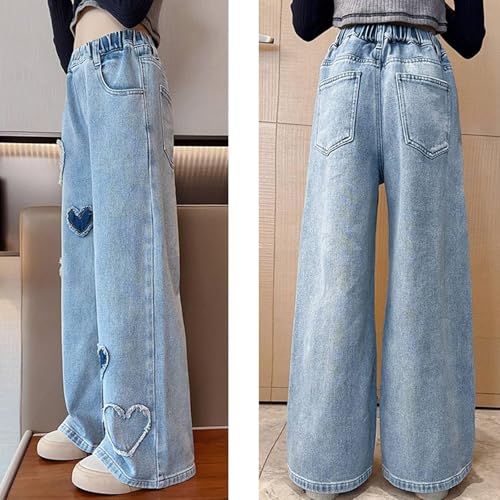 Girls Loose Jeans, Elastic Waist Loose Jeans, Printed Casual Wide Leg Loose Blue, 170cm 6