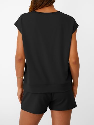 HOT ! LILLUSORY Womens Crew Neck Cap Sleeve Drawstring Two Piece Summer short Sets Sweatsuit with Pocket