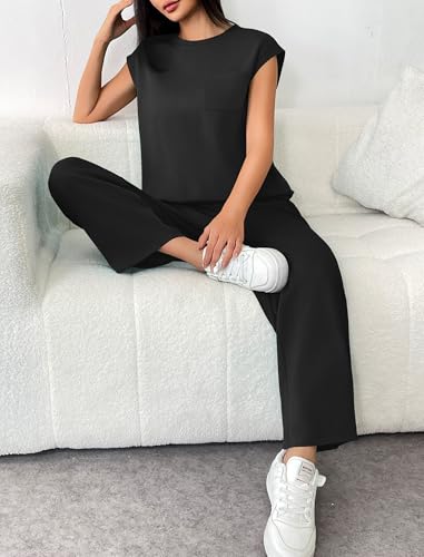 PINSPARK 2 Piece Sets for Women Summer Lounge Set Cap Sleeves Sweatsuit Cropped Wide Leg Pants 2025 Matching Travel Tracksuit 2