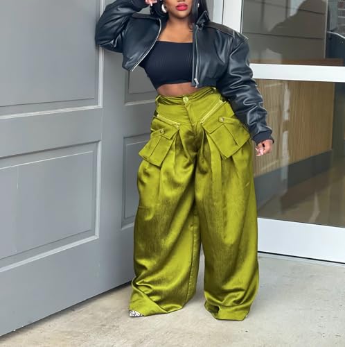HOT ! Womens Casual Baggy Cargo Pants with Pockets Straight Wide Leg Satin Trousers Streetwear Sweatpants