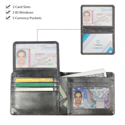 • Feature:Bifold wallet and 2 id windows card bag have a total of 3 card slots,3 currency pockets and 3 id windows, it’s easy to carry your important credit card, ID card, coins, receipts, and tickets