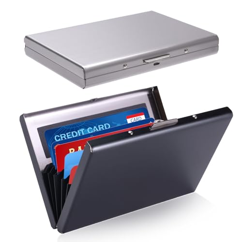 • 2 PCS, 6 Card Slots: 2 RFID shielding boxes, silver and black. Exquisite frosted shell, smooth touch, not easy to leave fingerprints. Equipped with independently separated card slots, a total of 6. Each card slot can accommodate 1-2 cards, easily storing credit cards, access cards and ID documents, avoiding card stacking friction while maintaining a thin and smooth appearance. The safety buckle prevents the card from accidentally slipping, ensuring digital security