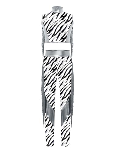 YEAHDOR Girls Hip Hop Jazz Dance Outfits Zebra Print Metallic Crop Tops and Skinny Leggings Athletic Outfits Silver 14 Years 1