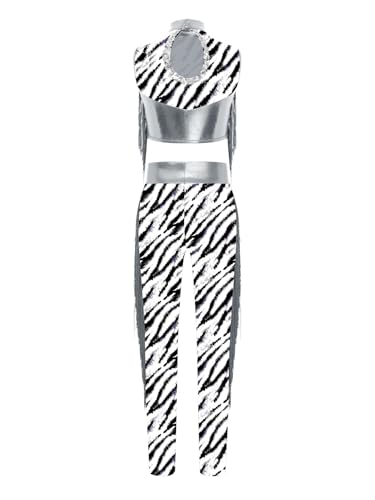 YEAHDOR Girls Hip Hop Jazz Dance Outfits Zebra Print Metallic Crop Tops and Skinny Leggings Athletic Outfits Silver 14 Years 2