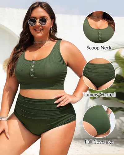 Plus Size 2 Piece Swimsuit - Womens High Waisted Bikini Tummy Control Bathing Suit Ribbed 2025 Swimwear 5