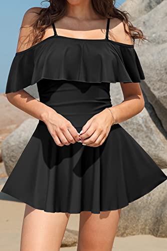 SHEKINI Women's Off-Shoulder Ruffled Flounce Swim Skirt Ruched One Piece Swimdress 1
