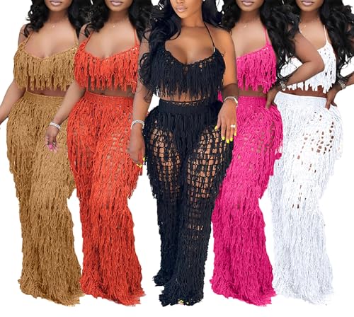 Tbahhir Women 2 Piece Vacation Outfits Sexy Crochet Bikini Coverups Beach Suits Halter Top Pants Sets Fringe 5