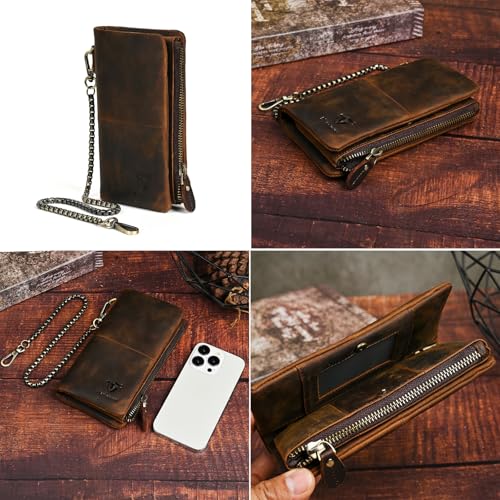 More information about Genuine Crazy Horse Leather Travel Gift Coin Pocket Card Case Long Organizer Chain Rfid Wallet Purse With Snap For Men Male 1029 (1029 Brown)