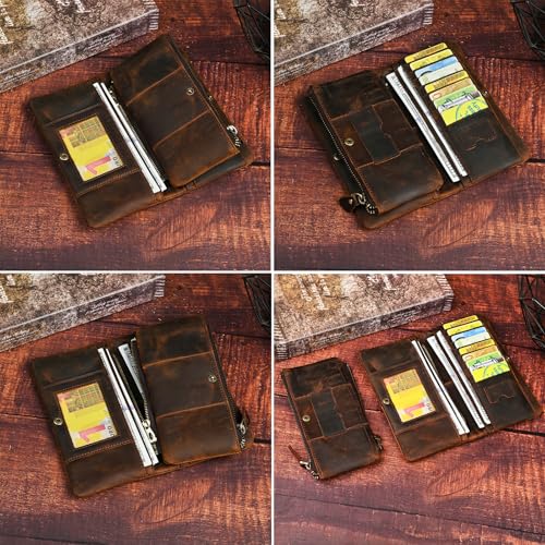 Genuine Crazy Horse Leather Travel Gift Coin Pocket Card Case Long Organizer Chain Rfid Wallet Purse With Snap For Men Male 1029 (1029 Brown) 7