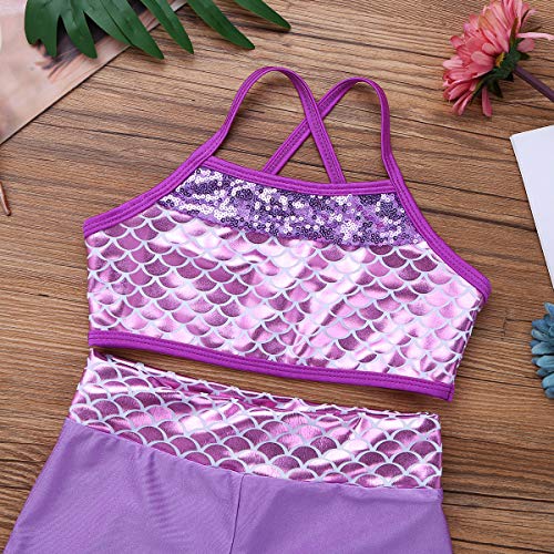 Kids Girls Two Pieces Sports Dance Outfit Crop Tops Bra with Shorts set Gymnastics Athletic Leotard Swimwear Mermaid Scales Lavender 5-6 7