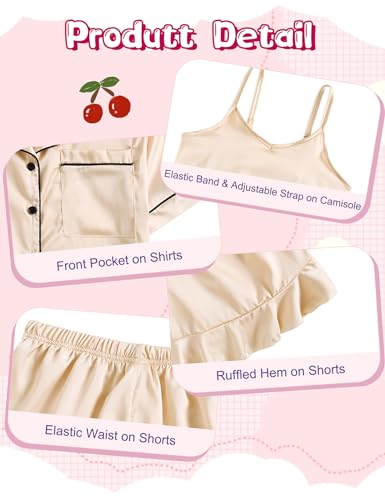 • 3 PCS PJ: Girls pajama sets contain *Button-up short sleeve shirt with classic shirt collar and front pocket, *Camisole top with adjustable spaghetti straps, *Ruffled shorts with stretchy waistband