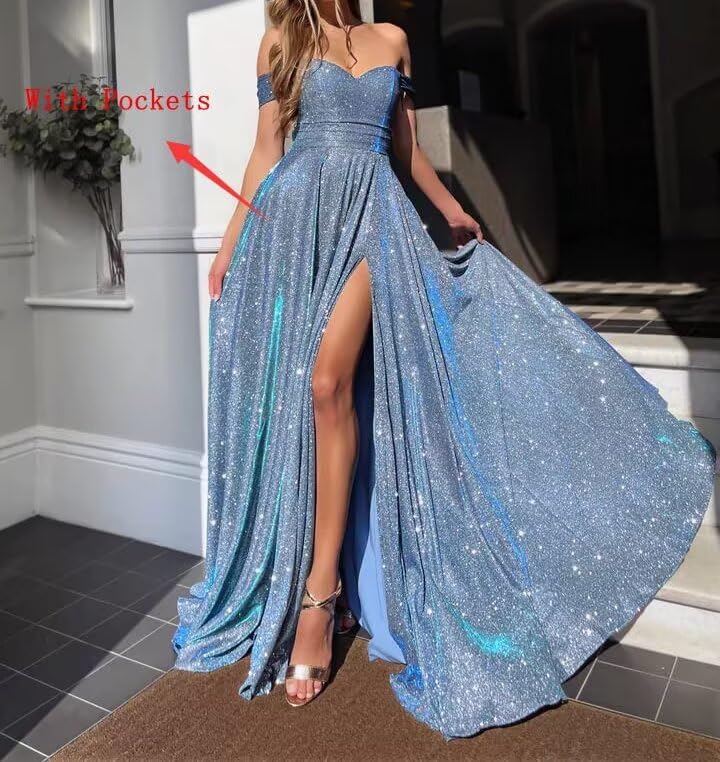 HOT ! Off Shoulder Prom Dresses for Women 2024 Sparkly Sequins Ball Gown Split Long Evening Formal Party Gowns with Pockets GL0007