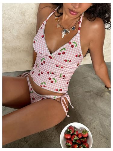• Features: 2 piece tankini set for women, cherry graphic, plaid gingham, halter v neck cami bikini top and tie side thong swimsuit