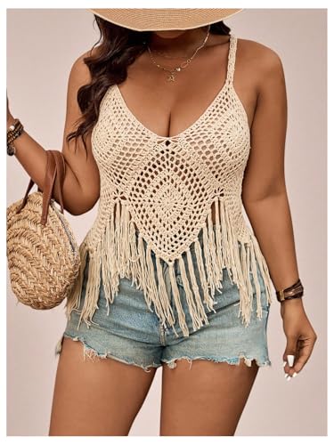 HOT ! SHENHE Women's Plus Size Crochet Cover Up Sleeveless Hollow Out Fringe Beach Tank Coverups