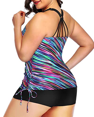 • This plus size swimwear includes a strappy tankini top and high waisted shorts. Strappy hollow-out back design looks sexy and cute. Push up built in bra provides great support.