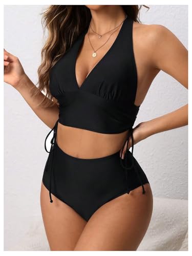 HOT ! SweatyRocks Women's Drawstring Halter Bikini Set High Waisted 2 Piece Swimsuit Bathing Suit