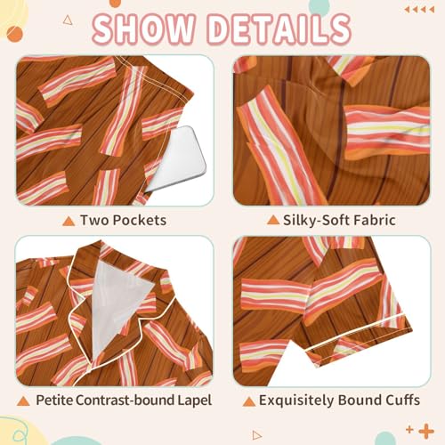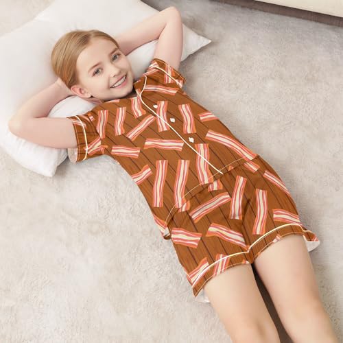 Satin Pajama Sets Short Sleeve Bacon Strips Wood Background Button Down Silky Nightwear 2 Piece PJS 5-14Y 1
