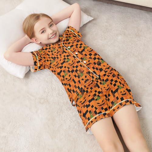 Satin Pajama Sets Short Sleeve Pumpkin Pattern Button Down Silky Nightwear 2 Piece PJS 5-14Y 7