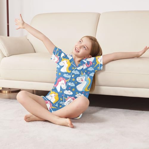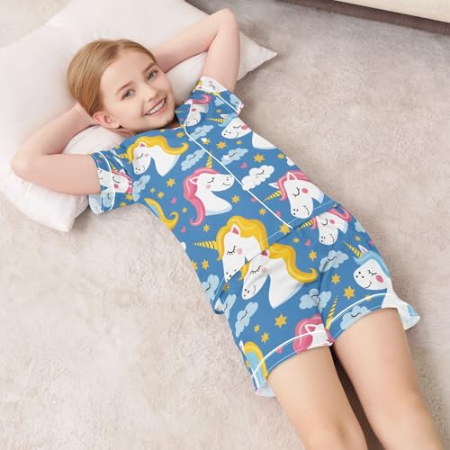 ALAZA Cute Unicorn Cloud Star Blue Satin Pajamas Set Short Sleeve Button Down Sleepwear Summer Pjs 2 Piece 1