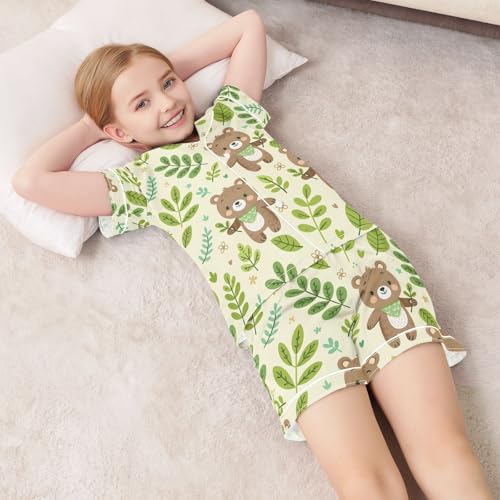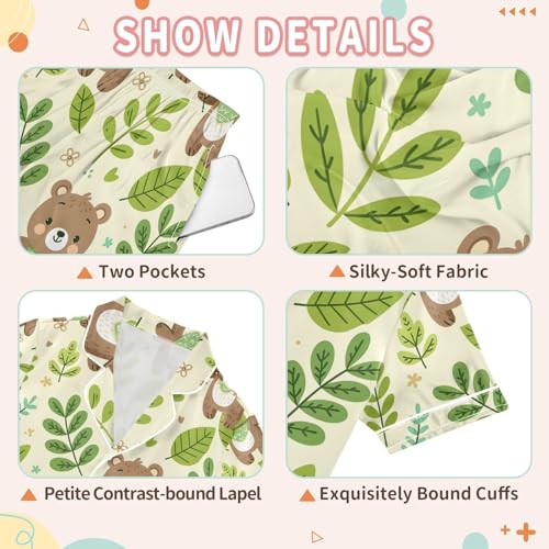 ALAZA Cartoon Bear Leaf Blossom Pajamas Satin Pajama Set Short Sleeve Button Down Sleepwear 6
