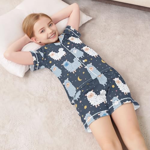 HOT ! ALAZA Cute Alpaca Moon Star Pajamas Satin Pajama Set Short Sleeve Button Down Sleepwear