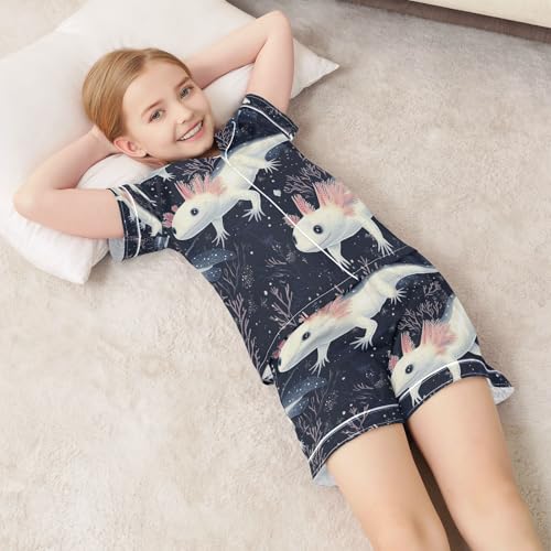 Satin Pajama Sets Short Sleeve Cute Axolotl in Darkness Button Down Silky Nightwear 2 Piece PJS 5-14Y 7
