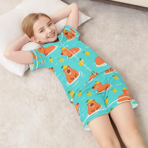Satin Pajama Sets Short Sleeve Cute Animals Swimming Playfully Button Down Silky Nightwear 2 Piece PJS 5-14Y 3