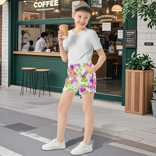 HOT ! Girls Athletic Shorts Pink Purple Floral White Comfy Casual Youth Summer Pajama Sleep Shorts with Pockets, X-Small