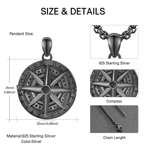 KINGWHYTE Compass Necklace S925 Sterling Silver Viking Rune Compass Pendant Nordic Pagan Jewelry Gifts for Men With Stainless Steel Chain-22+2inch(Black Gold) 5
