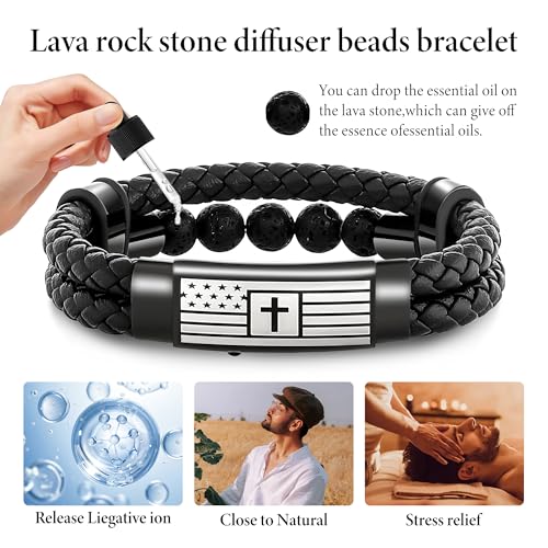 • STYLISH FAITH IN EVERY DETAIL – With its engraved cross, American flag, and black leather braid, this mens cross bracelet turns heads while subtly showcasing belief. Ideal for modern, faithful men with a bold style.