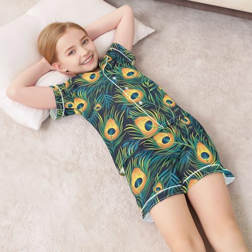 ALAZA Beautiful Blue Yellow Peacock Feather Satin Pajamas Set Short Sleeve Button Down Sleepwear Summer Pjs 2 Piece 1
