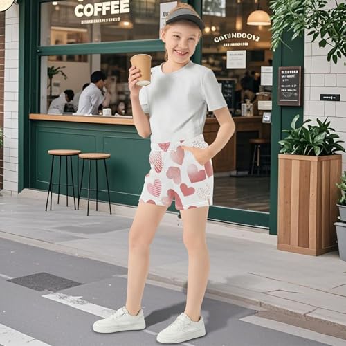 Girls Athletic Shorts Cute Lounge Pajama Shorts for Kids Teens with Lovely Hearts Rose Pink Floral Print, X-Small 6