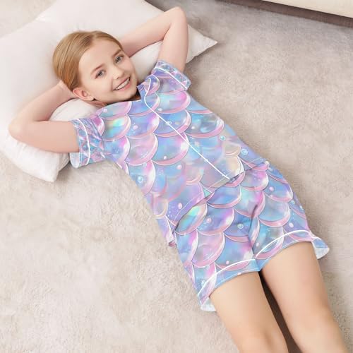 senya Purple and Blue Mermaid Scales Satin Summer Pajama Sets Silk Short Sleeve Button Down Sleepwear 5