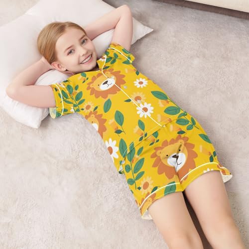 ALAZA Cute Lion Blossom Yellow Pajamas Satin Pajama Set Short Sleeve Button Down Sleepwear 6