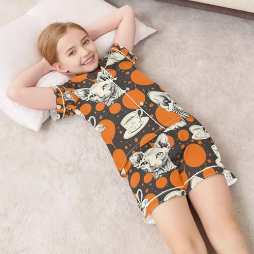 senya Retro Style Cats and Coffee Satin Summer Pajama Sets Silk Short Sleeve Button Down Sleepwear 1