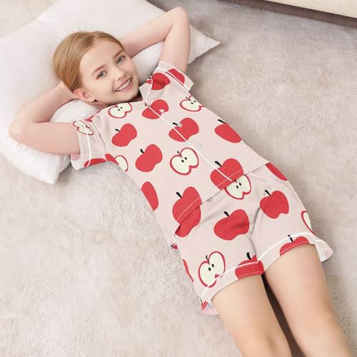 HOT ! Cartoon Cute Apple Print Summer Satin Pajama Set, Cute Button-Down Sleepwear Pj Set for Sleep Wears